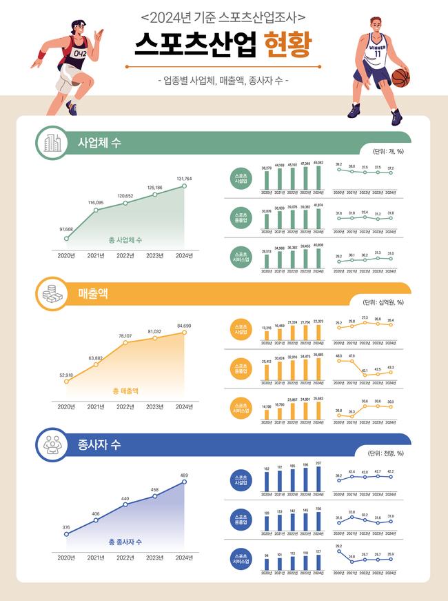 그 결과 2024년 기준 스포츠산업 매출은 84조6,900억 원으로 전년(81조 원) 대비 4.5% 증가했다. 종사자 수는 48만9,218명으로 6.7% 늘었고, 사업체 수는 13만1,764개로 4.4% 증가했다. 코로나19로 위축됐던 산업이 2020년 이후 5년 연속 성장세를 이어가며 규모를 키운 것이다.