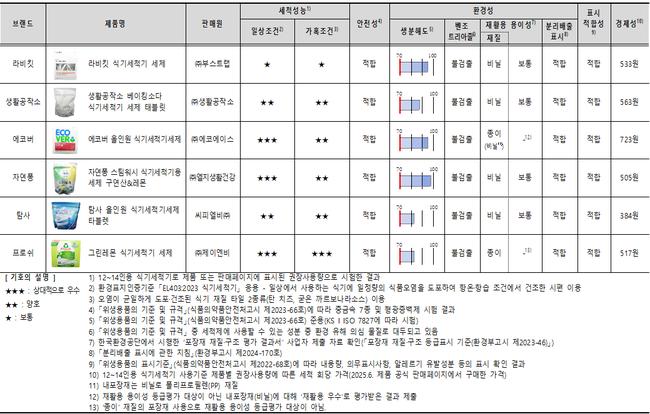 식기세척기 세제 품질 비교…세척력·가격 차이 뚜렷 - 제품별 세척성능·경제성 최대 1.8배 차이 - 생분해도·중금속 안전성은 전 제품 기준 충족
