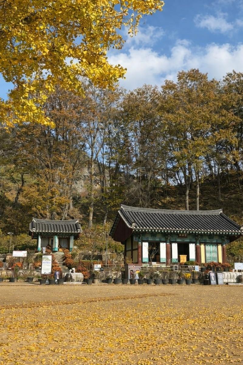 “가을 단풍이 물든 전통사찰 전경. 노란 은행잎이 마당을 덮으며 고즈넉한 분위기를 자아내고 있다.”
