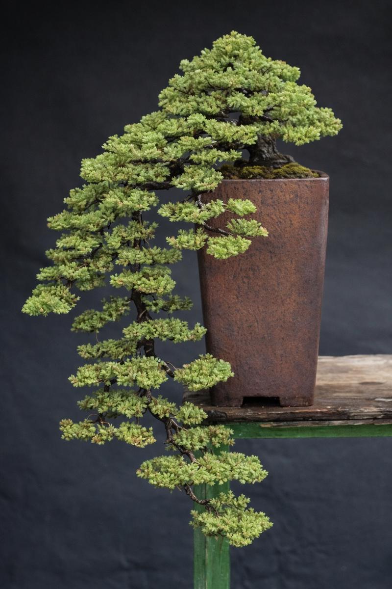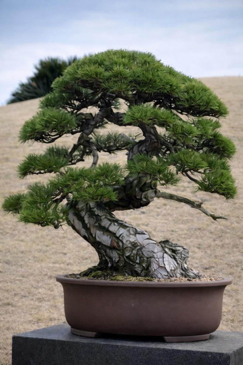 "자연의 힘에 순응한 사간형 분재. 바람과 세월이 만든 줄기 흐름이 그대로 살아있다"