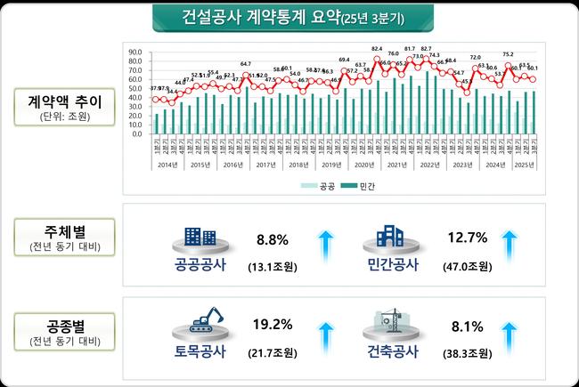 국토부는 “3분기 계약액 증가는 토목 중심의 대형 사업과 민간 주택사업 영향이 복합적으로 작용한 결과”라며 “관련 통계는 12월 30일부터 국토교통 통계누리집을 통해 확인할 수 있다”고 밝혔다.