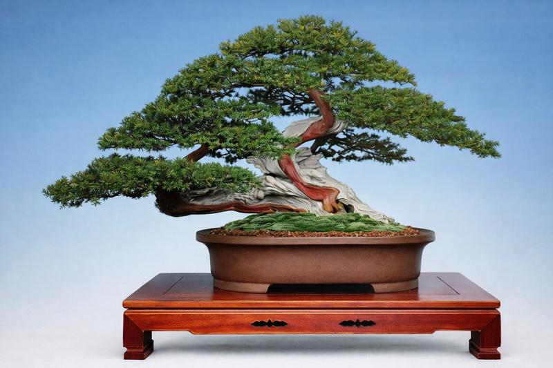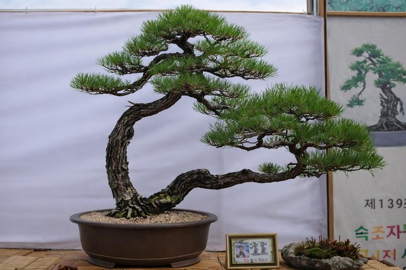 “곧게 뻗은 줄기와 균형 잡힌 가지 배치가 돋보이는 직간형 분재. 분재 수형의 기본을 보여준다.”