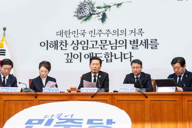 정청래 당대표는 이날 회의에서 “대한민국 민주화의 상징, 더불어민주당의 큰 별이 졌습니다”라며 이해찬 전 국무총리의 별세 소식을 전했다. 그는 고인이 향년 73세를 일기로 별세했다며 “민주화의 새벽을 열고 더불어민주당의 뿌리가 되어주신 이 시대의 큰 어른을 잃었다”고 말했다.
