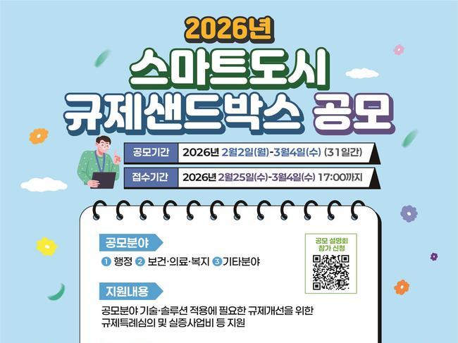 규제는 낮추고 삶의 질은 높인다…스마트도시 규제샌드박스 공모 - 2일부터 행정·보건·의료·복지 분야 중심 공모 시작 - 사업당 최대 5억 원 실증비·기간 4+2년 지원 - 현장 적용형 혁신기술 실증으로 국민 체감도 제고