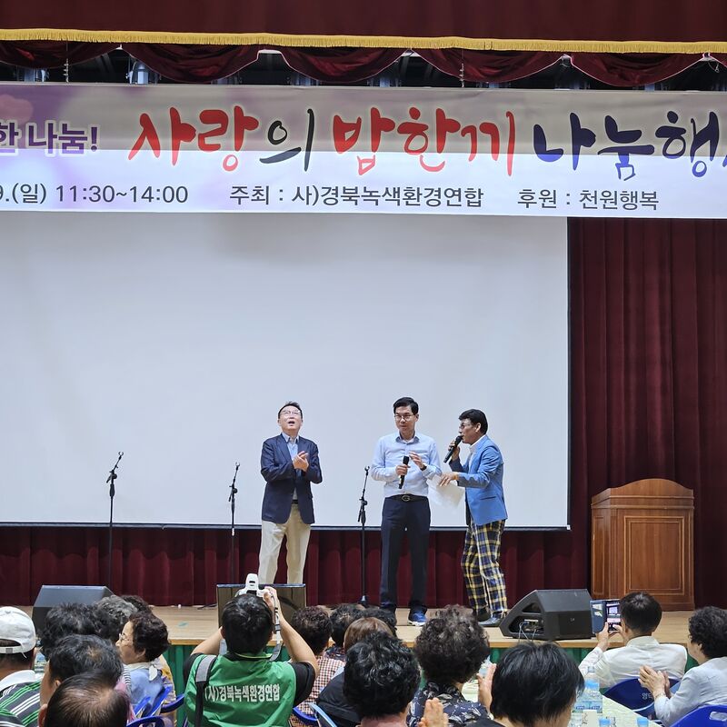 경북녹색환경연합 상임회장 배영달 은 회원들과 함께 지난 6월 29일 (일요일) 영덕군 영덕읍 영덕고등학교 체육관 에서 산불피해 영덕읍 주민 어르신들 400여명 참석한 가운데 밥 한끼 나눔 및 위로공연 행사를 개최 했다