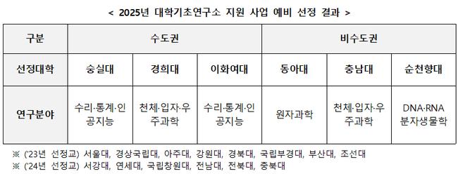 2025년 선정 대학들의 연구분야는 ▲숭실대·이화여대: 수리·통계·AI ▲경희대·충남대: 천체·입자·우주과학 ▲동아대: 원자과학 ▲순천향대: DNA·RNA 분자생물학 등이다.