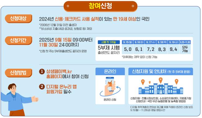 신청은 출생연도 끝자리에 따라 5부제로 운영된다. 첫 주는 0·5, 1·6, 2·7, 3·8, 4·9 순으로 신청할 수 있고, 오는 20일부터는 누구나 신청 가능하다. 지원대상자 여부와 지난해 월평균 카드실적은 17일 오전부터 알림톡으로 개별 안내된다.