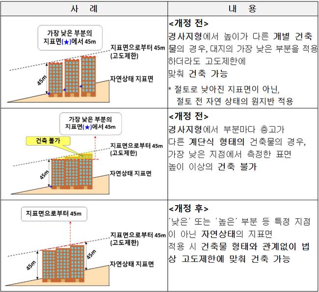 기존에는 대지 중 ‘가장 낮은 지점’을 기준으로 건축물 높이를 산정했기 때문에, 경사지에서는 고도제한을 초과하지 않더라도 계단식 건축물 등의 형식에 따라 건축이 불가한 사례가 적지 않았다.