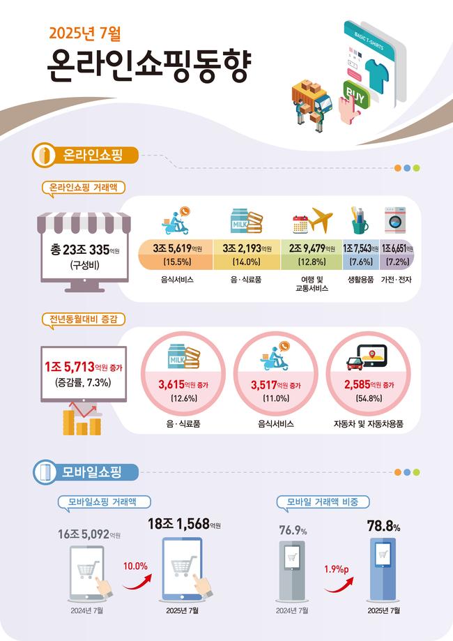 통계청이 발표한 ‘2025년 7월 온라인쇼핑 동향’에 따르면, 지난 7월 온라인쇼핑 총거래액은 23조 335억 원으로 전년 같은 달보다 7.3%(1조 5,713억 원) 증가했다.