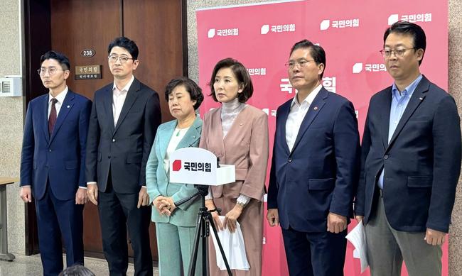 나경원·곽규택·주진우·송석준·박준태·조배숙 의원은 9일 오후 서울 여의도 국회 본관에서 기자회견을 열고 정부조직법 개편과 사법 개혁을 둘러싼 민주당의 움직임을 강하게 규탄했다. 이들은 "검찰 해체와 대법관 증원은 결국 사법 장악을 목표로 한 위헌적 시도"라고 주장했다.
